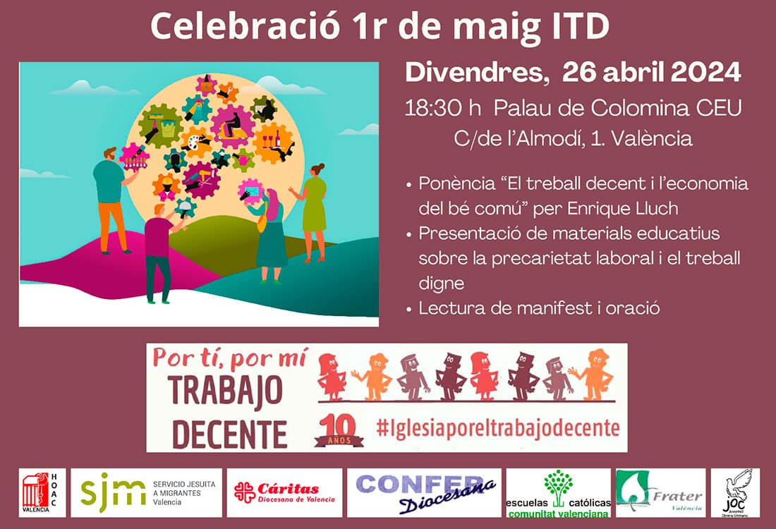 Con motivo del 1o de mayo, las entidades que forman ITD en la diócesis de Valencia han convocado un acto que se celebrará este viernes 26 de abril, a partir de las 18.30 horas en el Palacio de Colomina CEU (C/Almudín, 1. València).